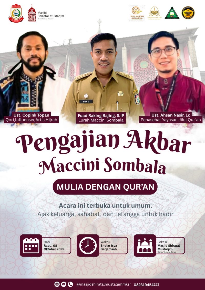 KabarReal.Com, Makassar – Dalam upaya memperkuat keimanan dan menumbuhkan kecintaan masyarakat terhadap Al-Qur’an, Pemerintah Kelurahan Maccini Sombala menggelar Pengajian Akbar bertajuk “Mulia Dengan Al-Qur’an” pada Rabu akan datang, 8 Oktober 2025 bertempat di Masjid Shiratal Mustaqim Pukul 19.00 Wita