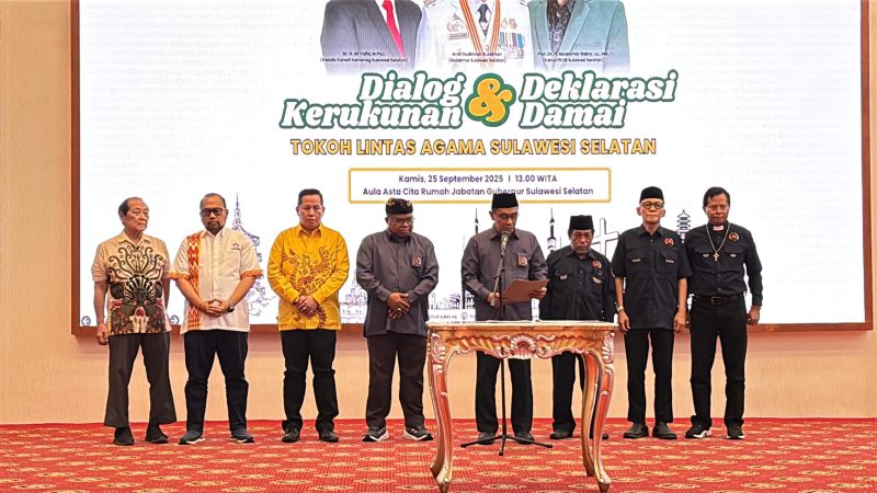 KabarReal.com, Makassar – Forum Kerukunan Umat Beragama (FKUB) Provinsi Sulawesi Selatan bersama pimpinan majelis agama di Sulsel menggelar Dialog Kerukunan dan Deklarasi Damai Tokoh Lintas Agama di Aula Asta Cita, Rumah Jabatan Gubernur Sulsel, Kamis (25/9/2025).